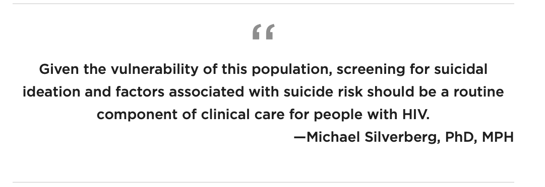 “People with HIV have higher rates of depression, anxiety, and other medical conditions than people without HIV,” Satre said. “They also have higher rates of substance use that put them at risk for suicidal behavior. While we knew about these vulnerabilities, this study provides health care teams with specific risk factors they can keep in mind to better identify patients who may be at risk for suicidal thoughts.”