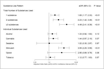 They found that suicidal ideation was higher among those reporting substance use, particularly among those using stimulants (such as methamphetamine or cocaine) or multiple substances. Compared with those who did not report any substance use problems, odds of suicidal thoughts were 1.7 times higher with use of 1 substance, and 4.5 times higher with 3 or more substances.