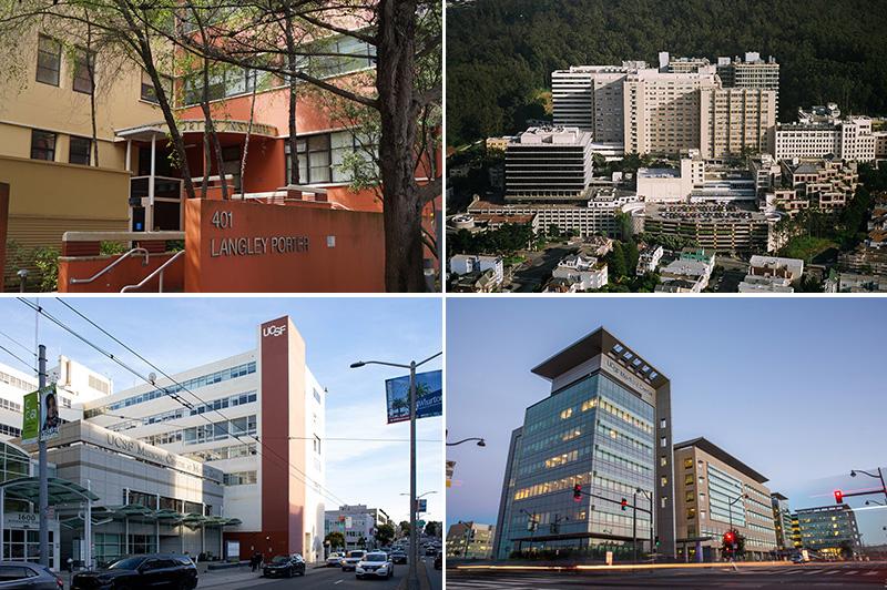 Clockwise, from top left: UCSF Langley Porter Psychiatric Hospital, UCSF Helen Diller Medical Center at Parnassus Heights, UCSF Medical Center at Mission Bay, and UCSF Medical Center at Mount Zion